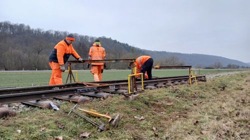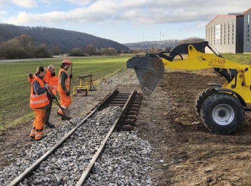 Gebäude, Fahrzeuge und Gleisbau-Vorbereitungen
