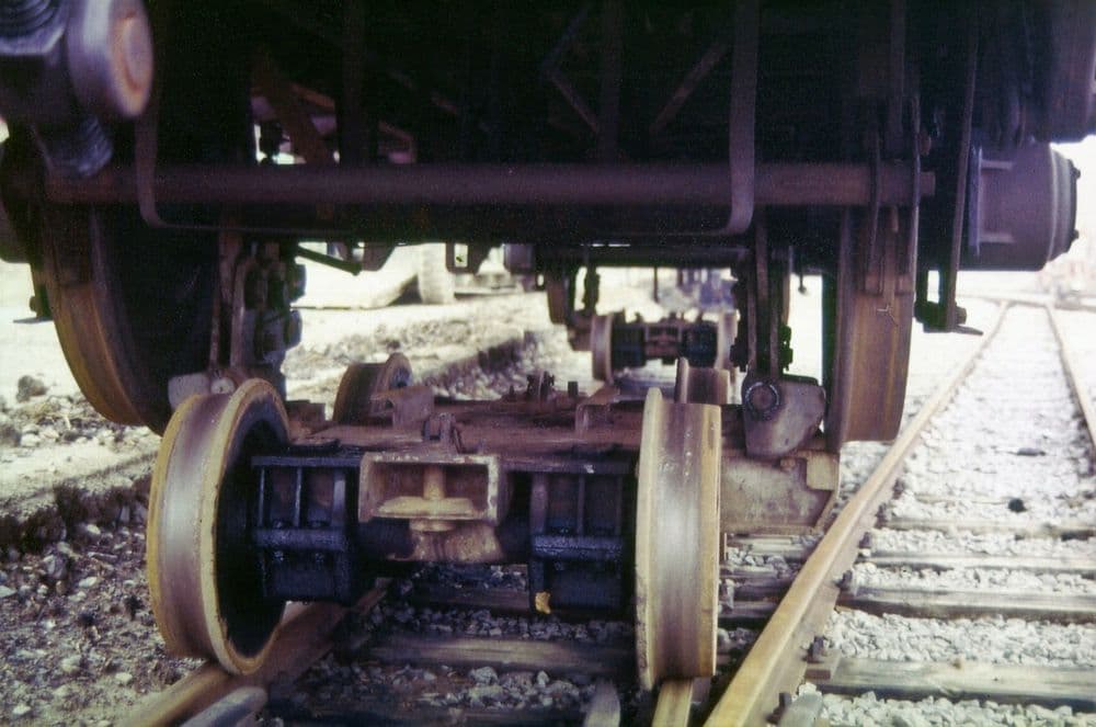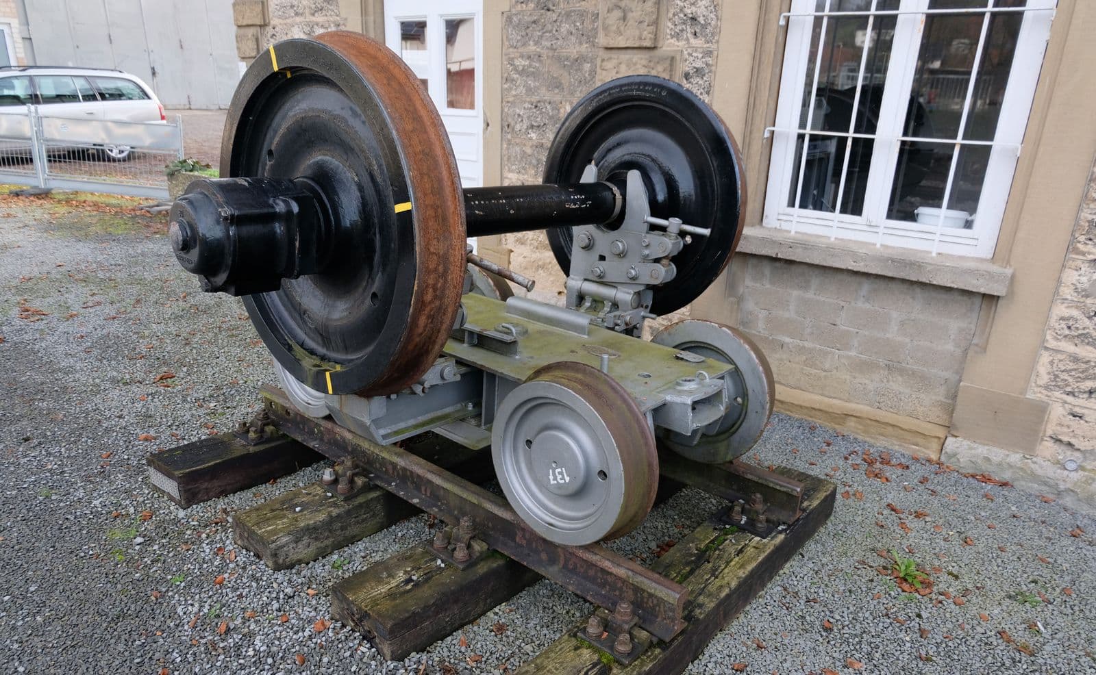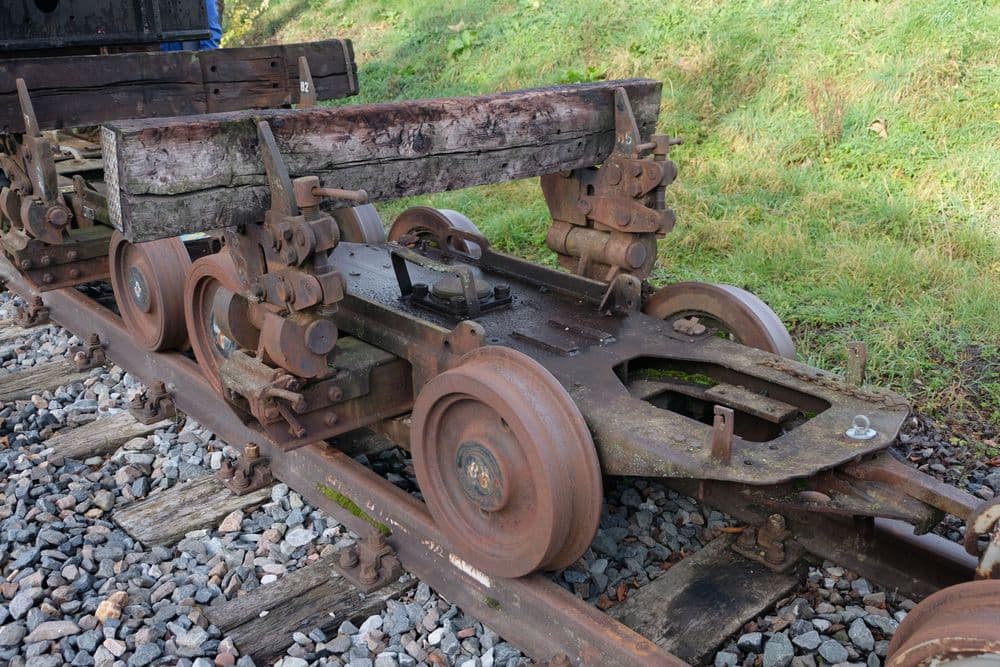 Detailaufnahme eines aufgebockten Wagens. Gut zu sehen ist, dass sich der normalspurige Wagen nur mit seinen Spurkränzen auf dem Querträger abstützt. Die Gabeln zwischen den Radscheiben verhindern lediglich ein Herabrollen.