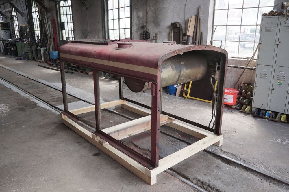 Bereits am 18.01.25 konnte die Lok ausgeachst werden und auf unsere Werkstatt-Rollböcke abgesetzt werden. Dadurch war es dann möglich insbesondere die Bremsanlage und weitere Teile der Druckluftanlage auszubauen. Auch der Fußboden im Führerhaus ist inzwischen demontiert um an die unter ihm liegenden Schrauben der Aufstiegstritte heranzukommen.