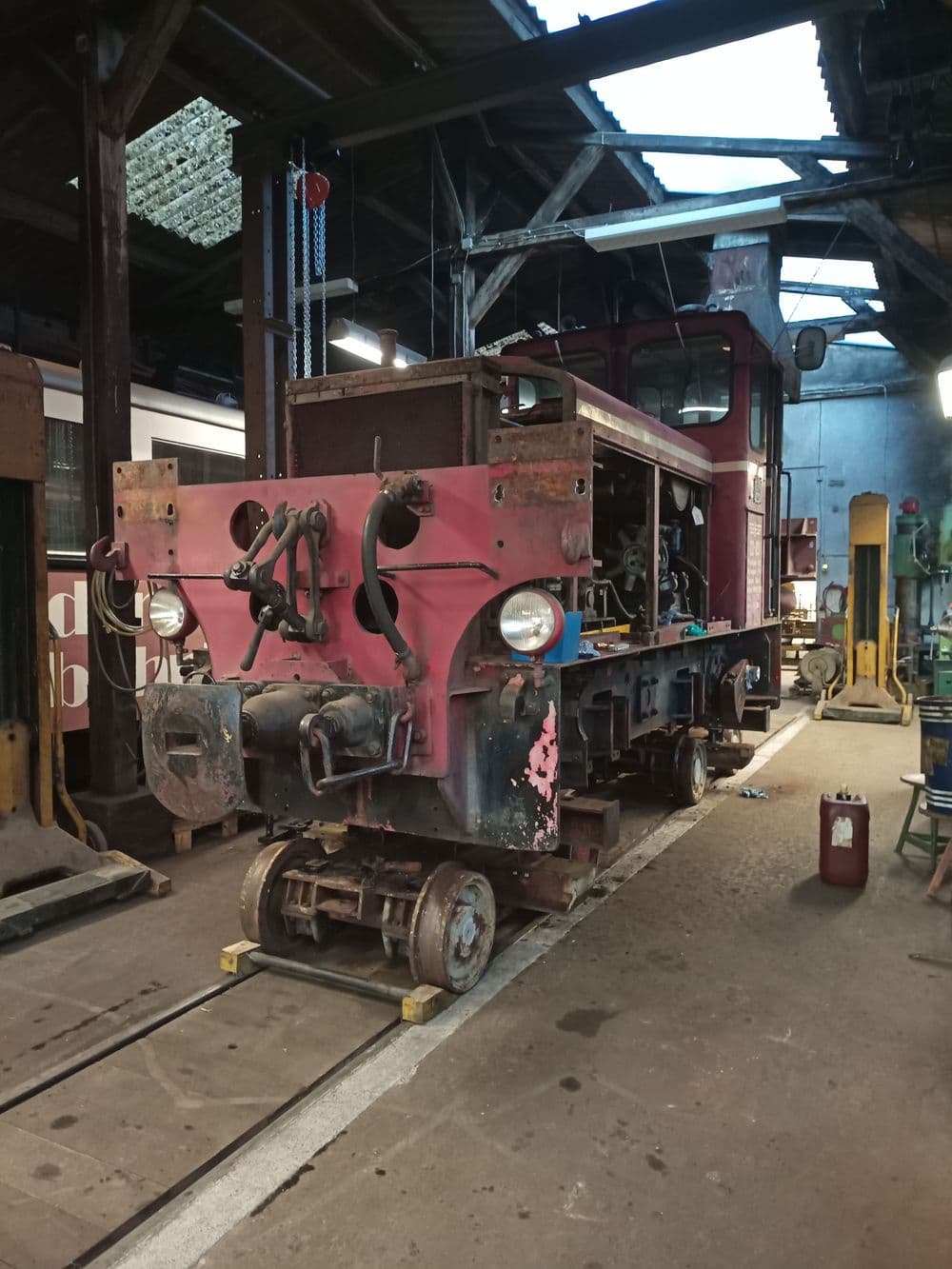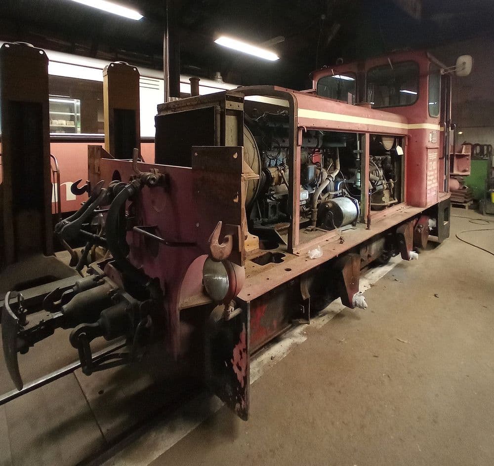 Am ersten Samstag im Jahr 2025 konnte endlich die Hauptuntersuchung der Lok angefangen werden. Als erstes erfolgte die Demontage der Normalspurpuffer, der Fronthaube über dem undichten Kühler, aller Seitentüren, aller Stangen, sowie der Druckluftanlage.