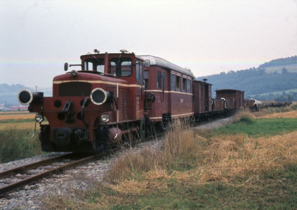 Lok 22-03 am 29.08.1981 mit einem GmP zwischen Klepsau und Dörzbach.