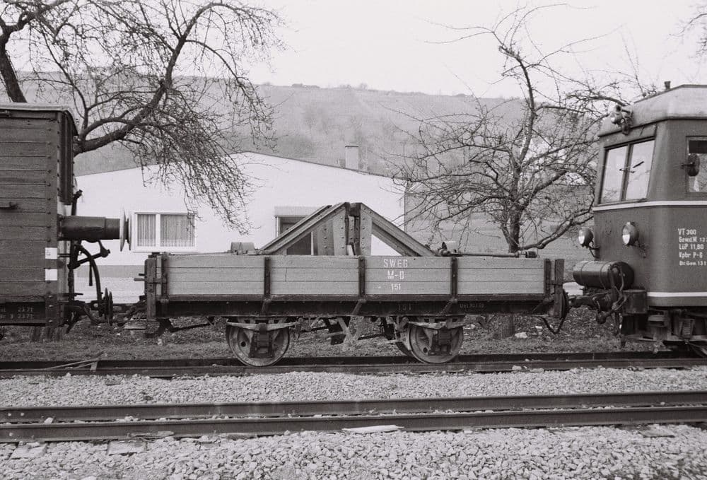 Wagen M-D 151 am 19.02.1972 in Dörzbach. Noch hat er seine Handbremse, ist aber schon mit Hebeböcken beladen.
