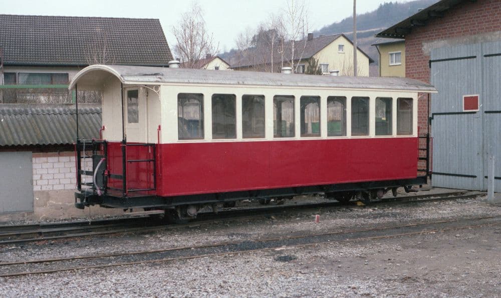 Wagen 116 steht im November 1983 frisch lackiert in neuer Farbgebung vor dem Lokschuppen in Dörzbach.