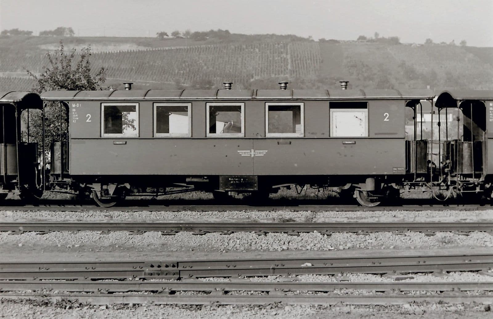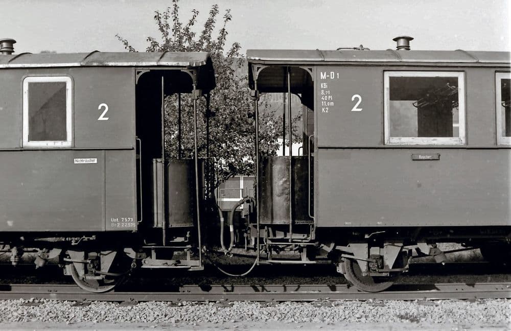 M-D 3 und M-D 1 im Oktober 1975 in Dörzbach. Gut zu erkennen sind die charakteristischen Schwenktüren an den Plattformen.