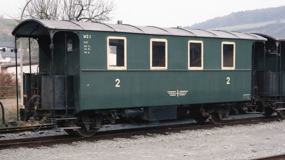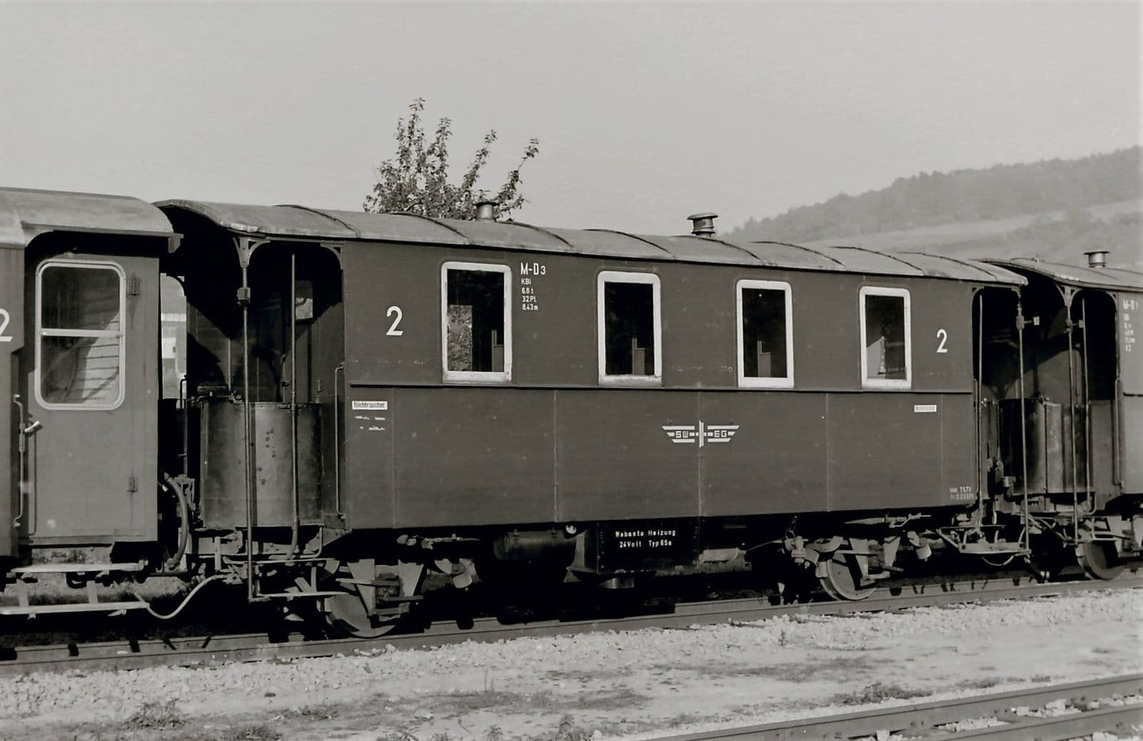 Unser M-D 3 ist einer von vier 1967 von der Bundesbahn erworbenen Personenwagen und zusammen mit den Wagen M-D 1 und M-D 402 bis heute im Jagsttal vorhanden. Er wurde im Jahr 1924, wie die meisten Wagen der staatlichen Schmalspurbahnen in Württemberg von der Maschinenfabrik Esslingen gebaut und an die Deutsche-Reichsbahn-Gesellschaft geliefert, die in als Nr. 409 auf der Zabergäubahn (Lauffen-Leonbronn) in Dienst stellte. Mit einer Stückzahl von insgesamt 38 Stück repräsentiert unser M-D 3 die meistgebaute Variante der württembergischen Schmalspurwagen. Im Gegensatz zum M-D 1 handelt es sich um einen Wagen der kurzen Bauform mit einer Länge von 8,4 Metern und vier Fenstern pro Seite. Ansonsten entspricht er seinen langen Geschwistern, hat also auch eine Wagenkastenbreite von 2,6 Metern und eine Höhe von ca. 3,2 Metern. Das sind für einen schmalspurigen Wagen der Spurweite 750 mm immer noch beachtliche Abmaße. Trotz der geringeren Länge erhielten alle Wagen der kürzeren Bauform Vereinslenkachsen, um einen guten Bogenlauf und geringeren Radverschleiß zu erreichen. Des Weiteren besitzt er auch die charakteristischen und nur an württembergischen Schmalspurwagen zu findenden Klose-Schwenktüren und württembergischen Mittelpufferkupplungen. Die anfängliche Gasbeleuchtung wurde um 1935 gegen eine elektrische ausgetauscht. Mit der Umspurung der Zabergäubahn auf Normalspur im Jahre 1964 wurde der Wagen zur Bottwartalbahn Marbach-Heilbronn Süd versetzt, bevor 1966 auch dort der Personenverkehr eingestellt wurde. Etwa zeitgleich wurde der vormals als 409 bezeichnete Wagen mit der Nummer 739 Stg in das aktuelle Nummernschema der DB eingereiht. 1967 wurde der Wagen durch die SWEG von der Bundesbahn erworben, um ihn im kurz zuvor aufgenommenen Schülerverkehr einzusetzen. Insgesamt gelangten vier Personenwagen von der Bundesbahn (M-D 1, M-D 2, M-D 3 und M-D 402) in das Jagsttal. So wurde aus dem Wagen mit der DB Bezeichnung 739 Stg der SWEG Wagen M-D 3. Er blieb bis auf den Einbau einer Webasto-Heizung statt seiner Dampfheizung 1968 und den Ausbau der Dachlüfter nahezu unverändert. Zusätzlich zum Schülerverkehr kam der Wagen auch seit 1971 in Museumszügen zum Einsatz.