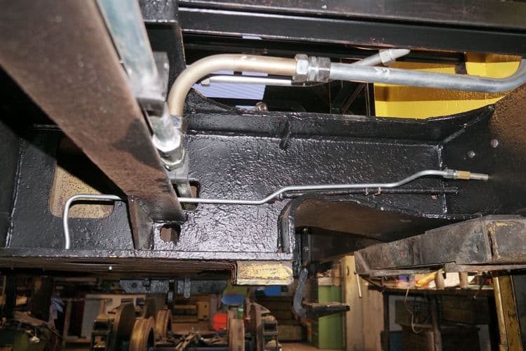 Im Juni 2023 wurde auch mit der Demontage von Bremszylinder, Luftbehälter, Bremsgestänge und Handbremse begonnen. Die vielen Kleinteile sowie Stangen und Hebel wurden gesäubert und frisch lackiert.