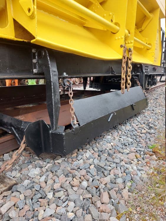 Als eine der letzten größeren Arbeiten stand der Wiedereinbau des Schotterkorbs auf dem Programm. Nach wenigen Reparaturen am Schotterkorb selbst wurde dieser wieder unter den Wagen geschoben und dort mit den Seilen der Hubeinrichtung verbunden. Zudem wurden die Dorne, die den Korb beim Anheben in eine definierte Position führen, angebracht.Nach den ersten Tests mussten noch die Spanneinrichtung für die Seile und die Ketten, die den Schotterkorb im abgesenkten Zustand ziehen, bearbeitet werden.