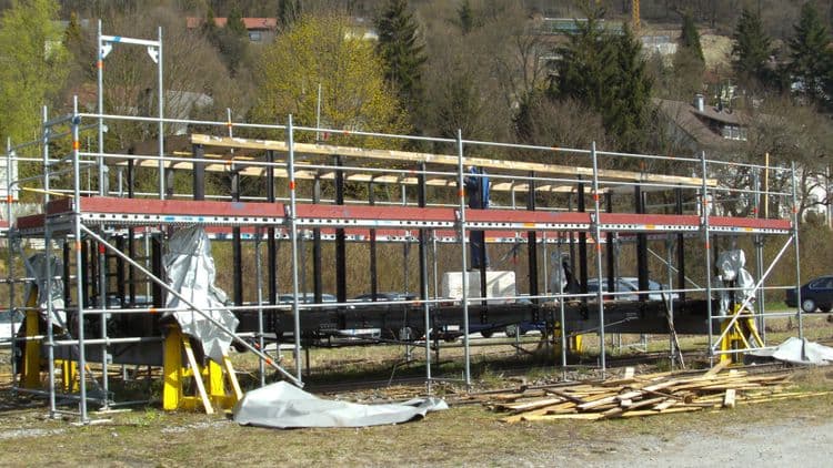 Im April 2012 steht der Sommerwagen ohne Drehgestellen zur Aufarbeitung noch in Jagsthausen. Der Rahmen ist bereits frisch lackiert und es wird fleißig am Dach gearbeitet.