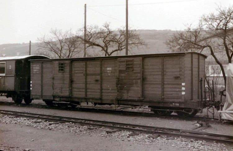 Noch als Güterwagen steht der M-D 113 im Jahr 1967 in Dörzbach. Auf dem Bild sind auch die wieder verschlossenen Fensteröffnungen aus der Zeit als Behelfspersonenwagen zu erkennen.