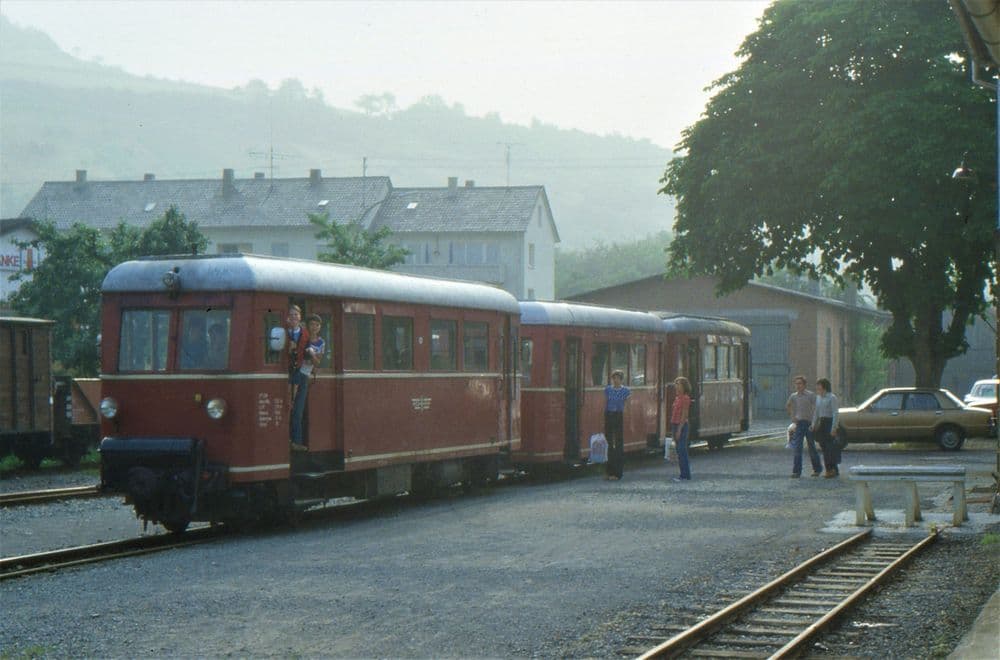 VT 300 mit einem typischen Schülerzug abfahrbereit im Bahnhof Dörzbach. Die beiden Triebwagenanhänger der sehr stimmigen Zuggarnitur, VB 400 und VB 401 stammen ebenfalls von der Rhein-Sieg-Eisenbahn.