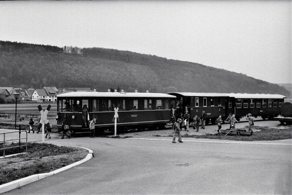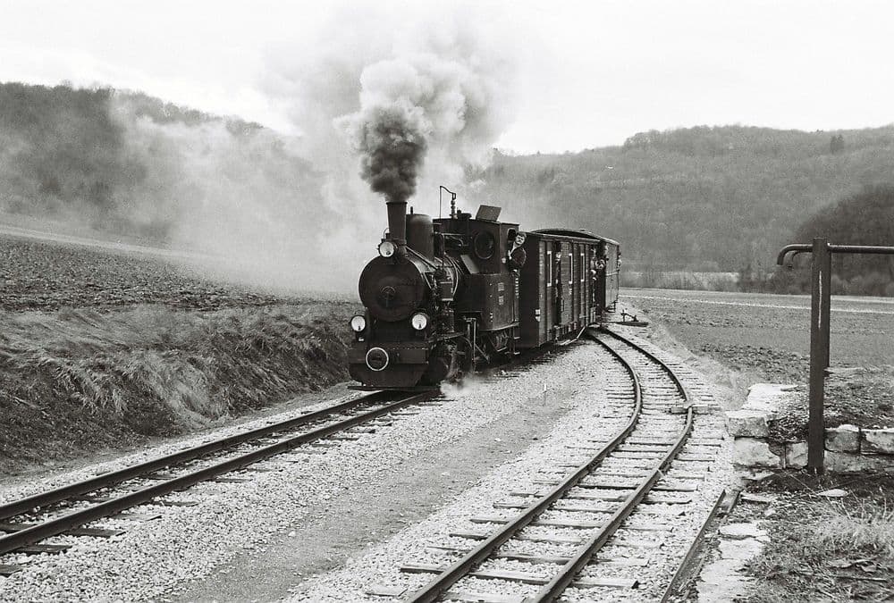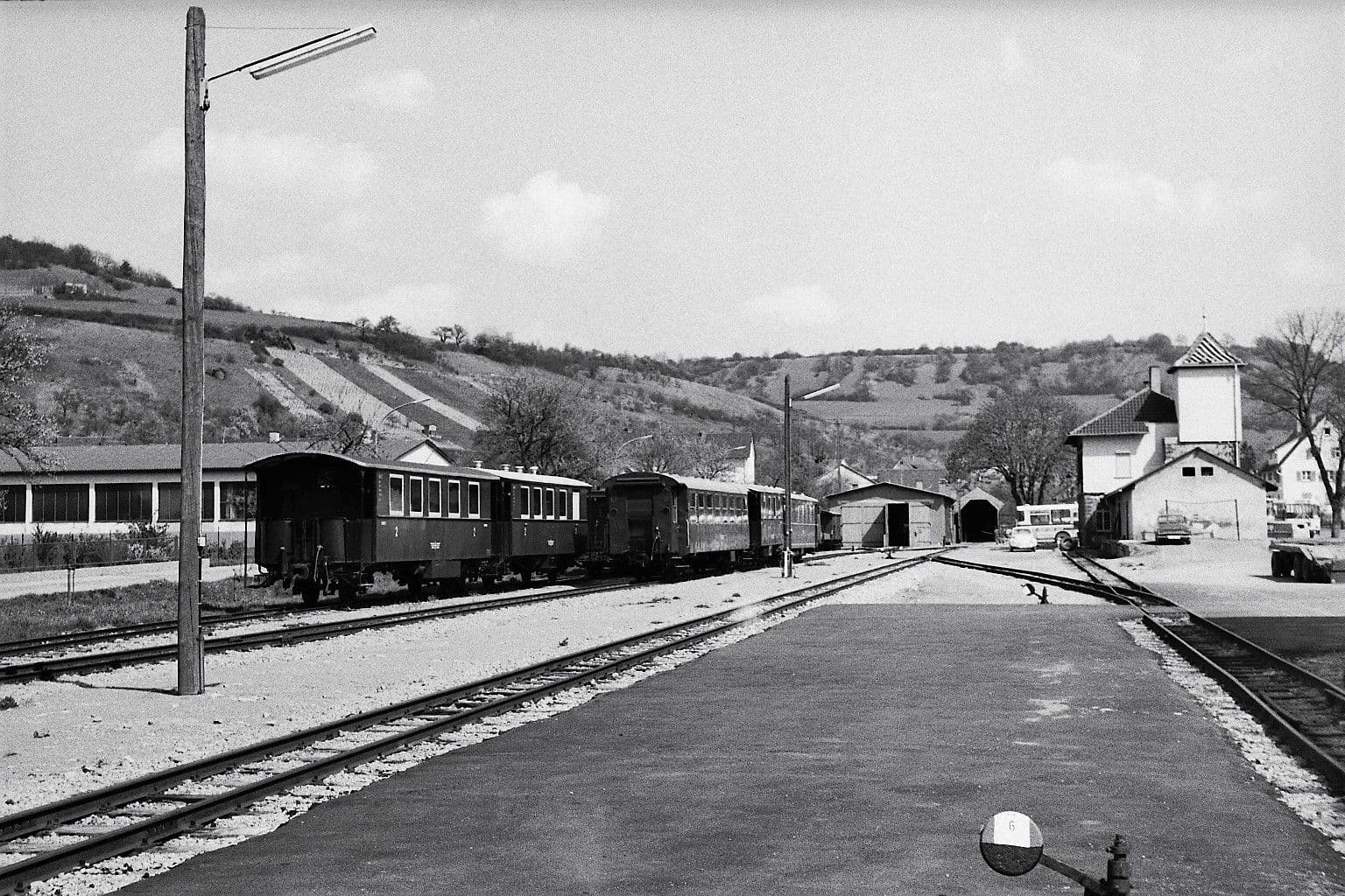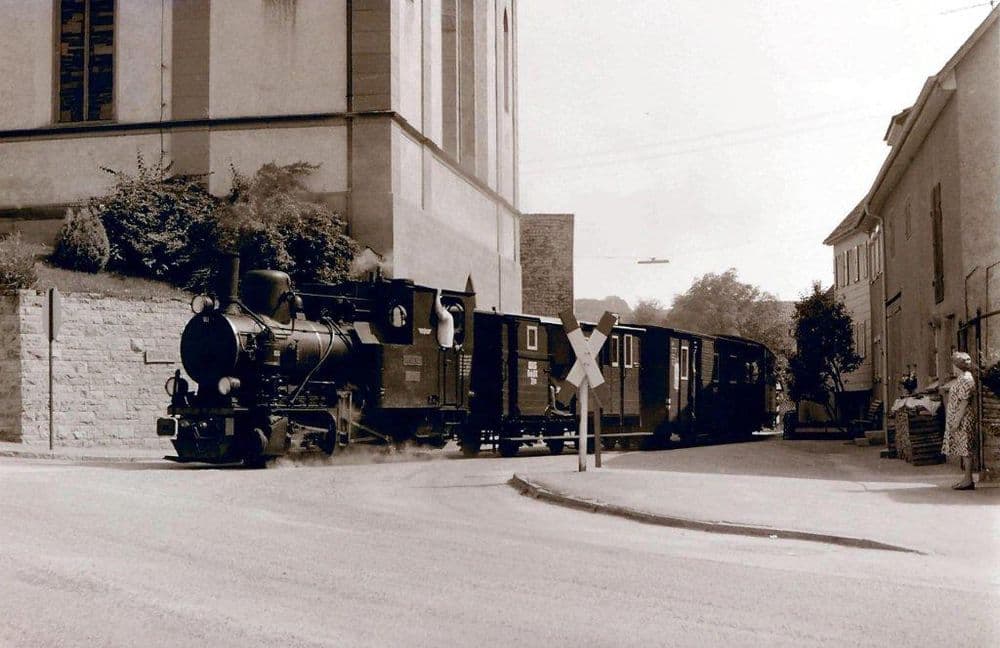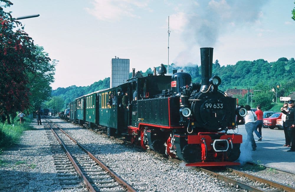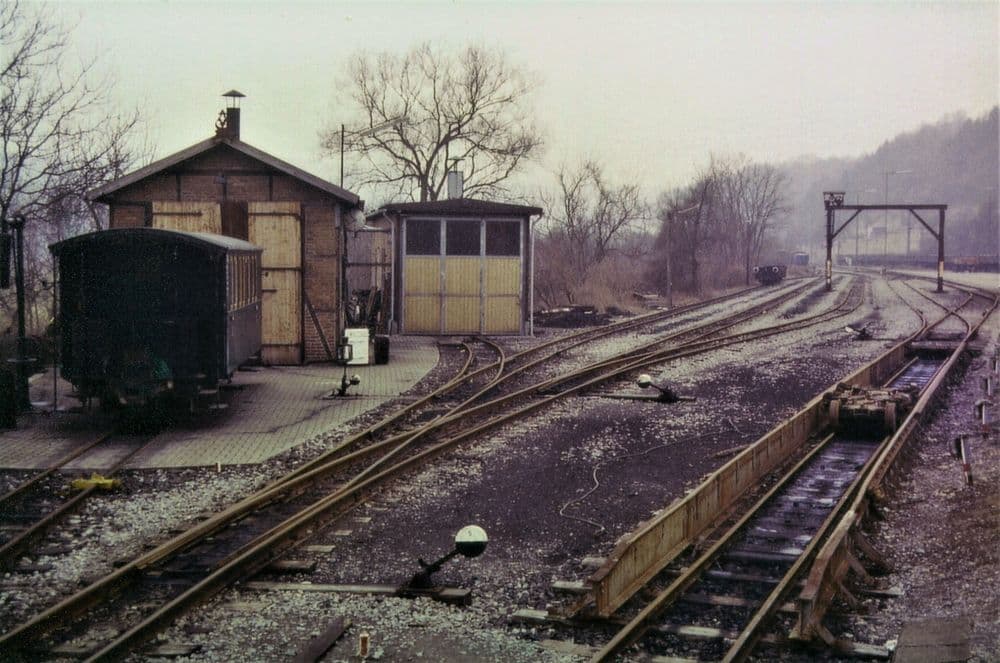In Möckmühl beginnt die Jagsttalbahn und schließt dort an die normalspurige von Stuttgart nach Würzburg führende Frankenbahn an. Aufgrund der anderen Spurweite und um Güter nicht immer umladen zu müssen, wurden Regelspurwagen auf sogenannte Rollböcke gestellt und konnten somit auf der Schmalspurbahn bewegt werden. Hierfür war eine Rollbockgrube, sowie umfangreiche Gleisanlagen vorhanden.Lok 99 633 steht am 21.05.1981 mit einem Museumszug am Möckmühler “Bahnsteig” zur Abfahrt bereit.