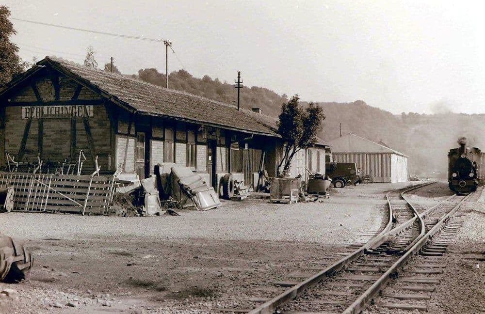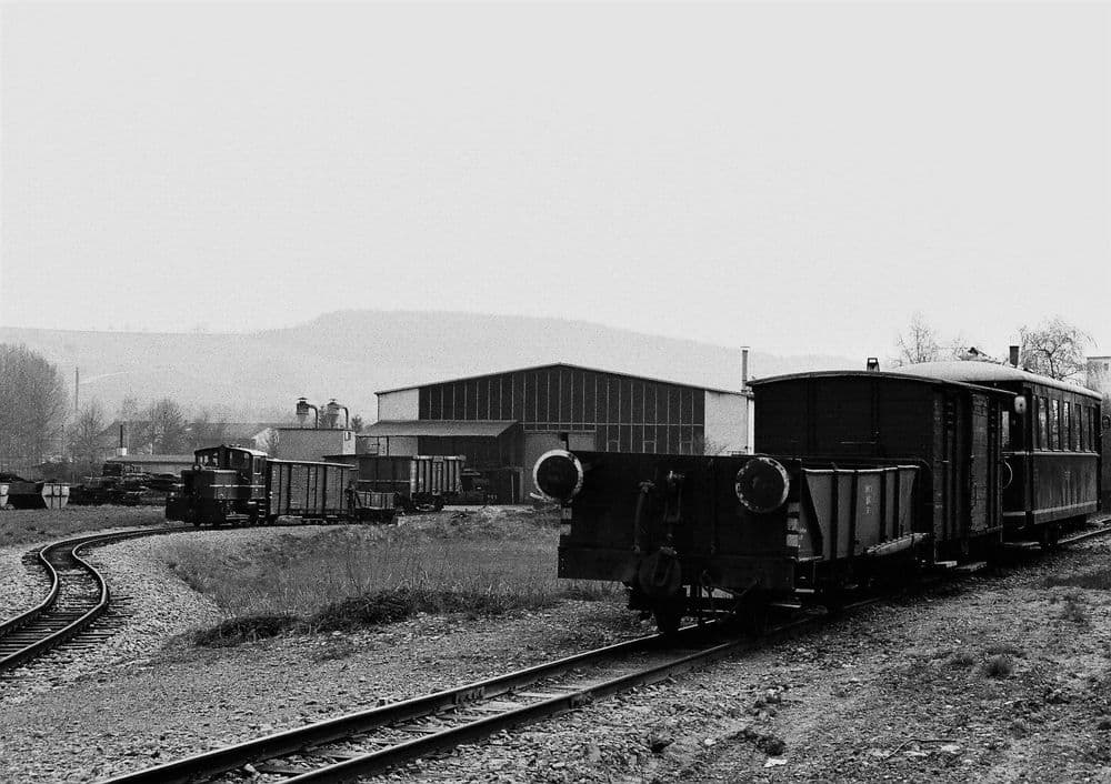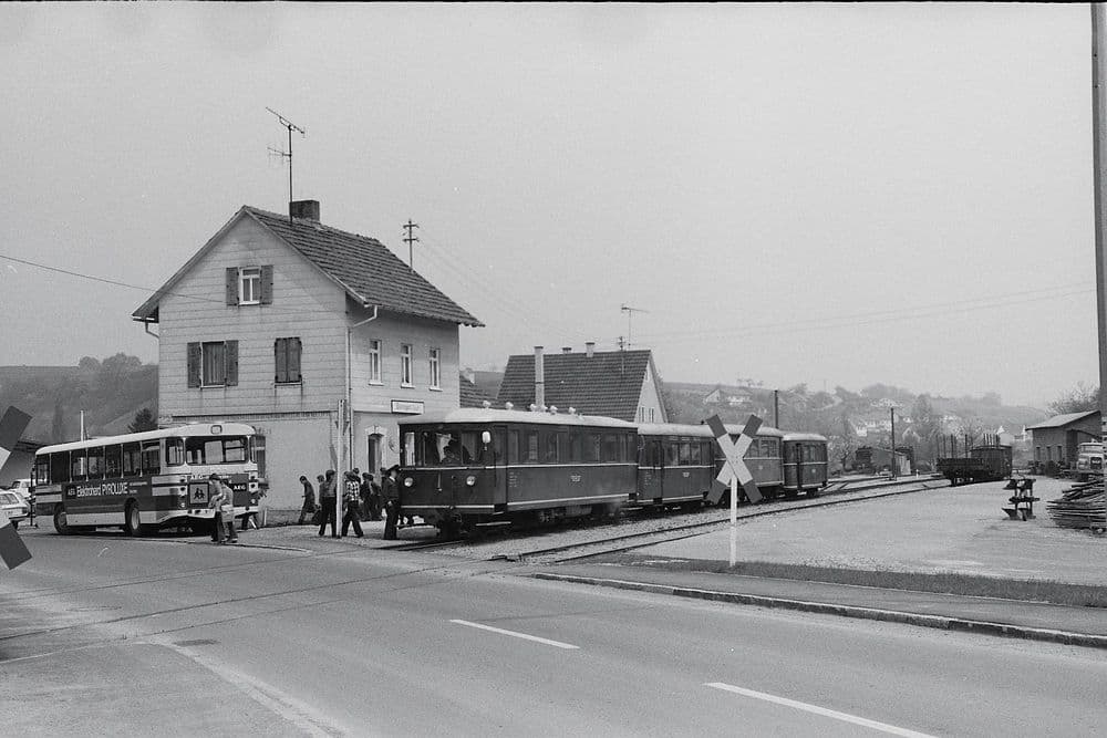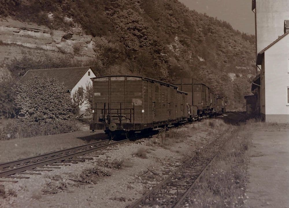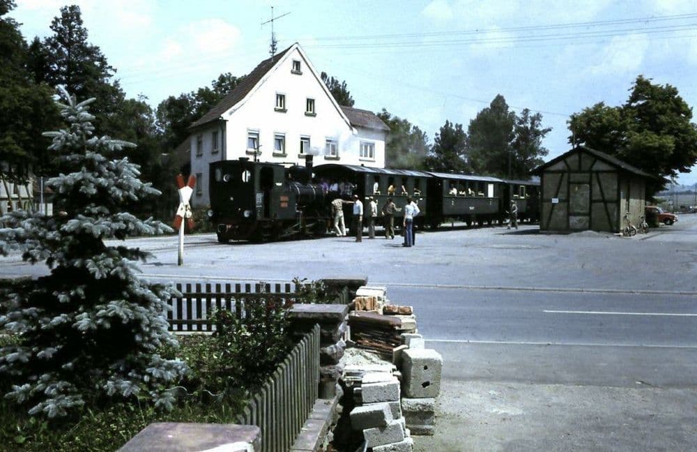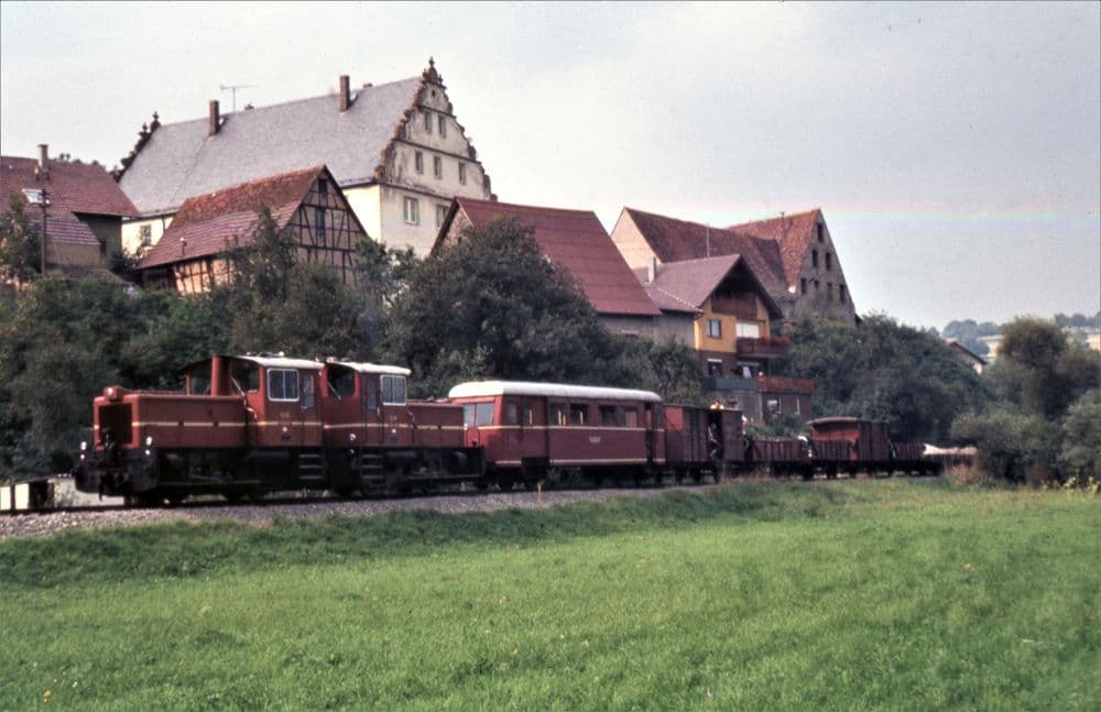 1958 wurde das Anschlussgleis für die Metallwarenfabrik Wöhrle errichtet. Das Schmalspurgleis zweigte von Dörzbach kommend ab und endete in einer Rollbockgrube. Ein Normalspurgleis führte noch bis in die Werkshalle hinein. V 22-01 bedient am 15.04.1978 den Anschluss. Der restliche Zug wurde währendessen auf dem Streckengleis abgestellt.