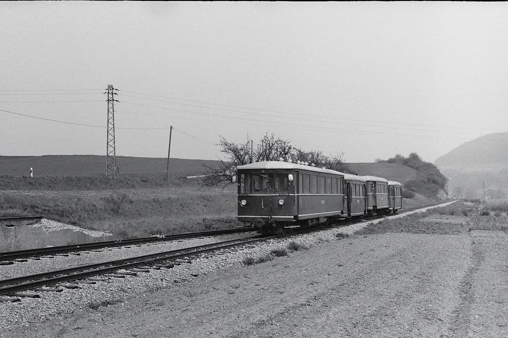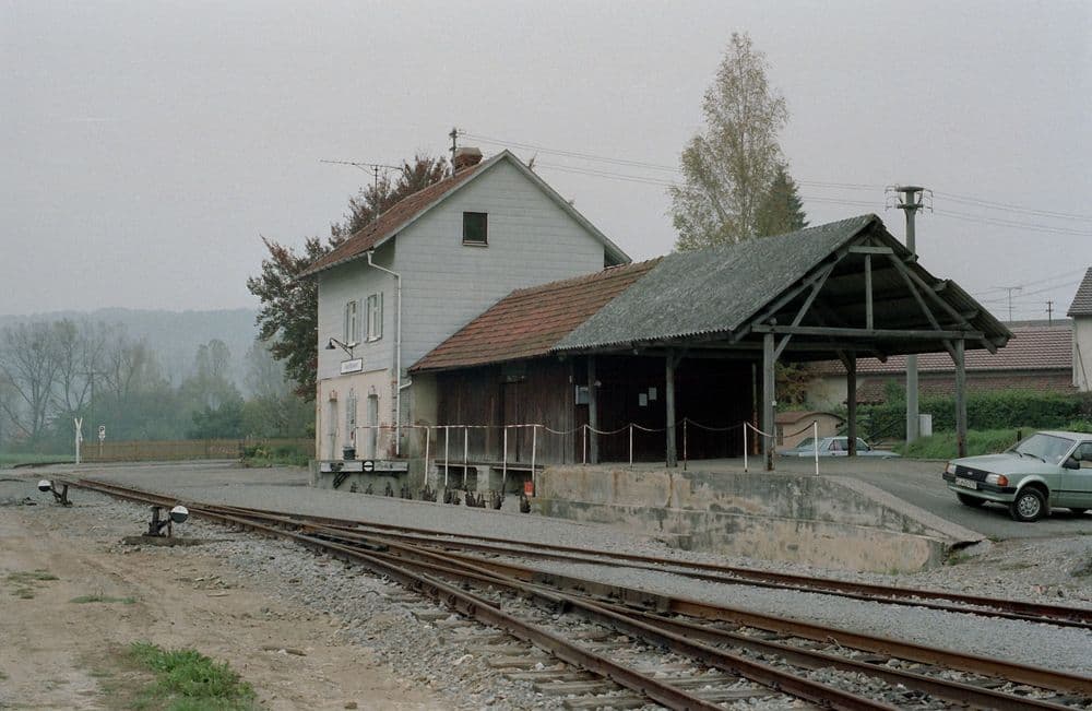 Der Bahnhof Gommersdorf verfügte über ein Ausweichgleis und ursprünglich noch über ein Stumpfgleis. Dieses wurde irgendwann in den Sechzigern zusammen mit dem kleinen Stationsgebäude abgerissen. Leider existieren von dort kaum Bilder aus Betriebszeiten. Stellvertretend dafür hier das Bild eines Güterzuges aus Dörzbach kommend kurz vor dem erreichen des Bahnhofes. Am 29.08.1981 war die heute parallel zur Strecke verlaufende Gommersdorfer Umgehungsstraße noch nicht gebaut.