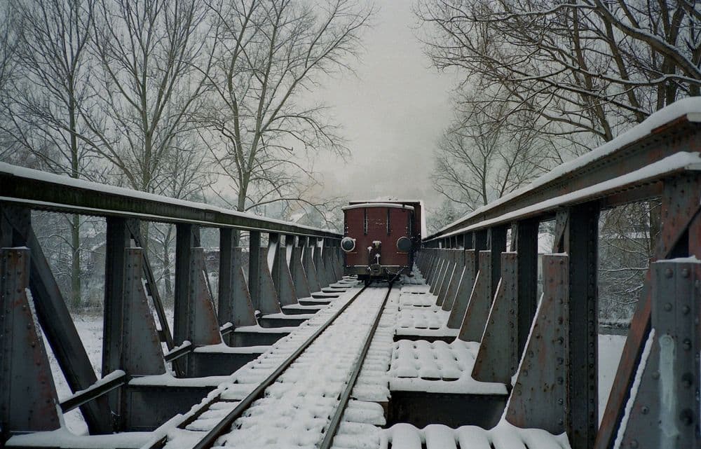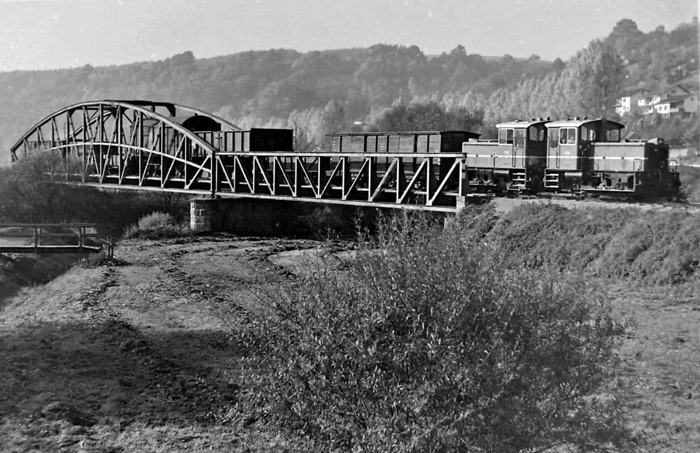 Ungefär 150 Meter weiter folgte die mit 90 Metern längste Brücke, auf der gesamten Strecke, über die Jagst. Am 22.11.1985 befährt ein Rollbockzug die Brücke auf dem Weg in den Möckmühler Bahnhof.Bedauerlicherweise wurden beide Möckmühler Brücken 1997 abgerissen.