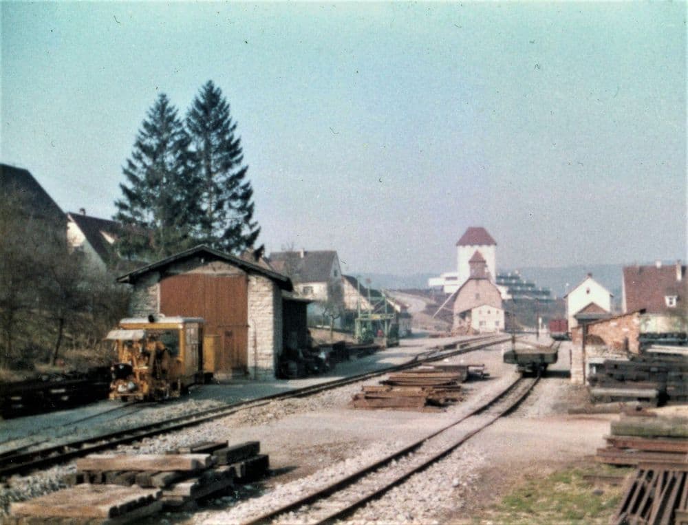Der Bahnhof 1982 in Blickrichtung Möckmühl. Im Hintergrund ist gut das große BAG-Lagerhaus zu erkennen. Außerdem zeigen die vielen Gleisbaumaterialien eindeutig den Standort der Bahnmeisterei.