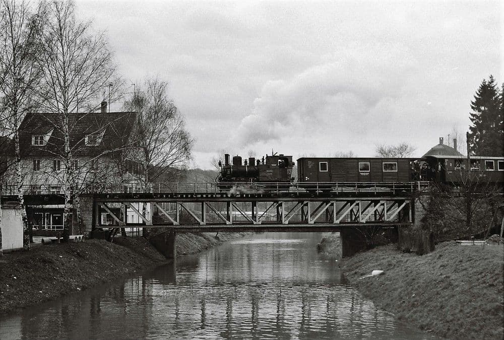 Direkt nach der Bahnhofsausfahrt befand sich die 24 Meter lange Seckachbrücke. Auf dem Bild wird diese gerade von der Lok “Helene” aus dem Möckmühler Bahnhof kommend überqueert.
