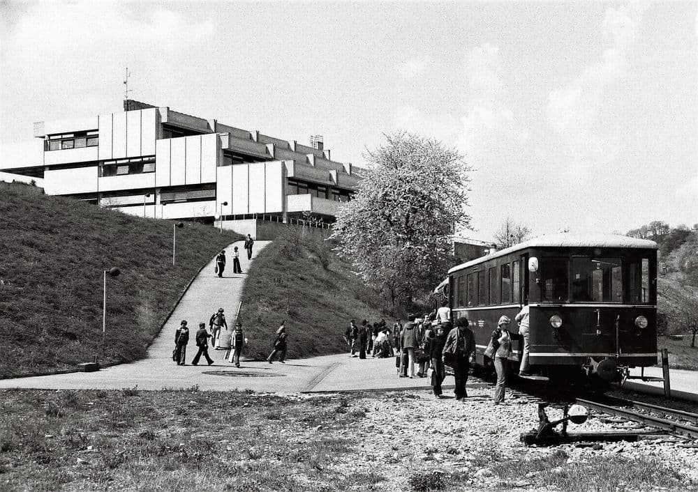 Der Haltepunkt befand sich unmitelbar vor dem eigentlichen Bahnhof. Er wurde 1973 unterhalb der damals neu gebauten “Max-Eyth-Schule” eigens für den Schülerverkehr eingerichtet. Benutzt wurde er nur bis zum Ende des Schülerverkehres 1979. Am 29.04.1978 steht VT 303 mit einem Schülerzug am Haltepunkt. Im Vordergrund ist das Stellgewicht der ersten Weiche des Bahnhofs Bieringen zu sehen. Das abzweigende Gleis führt zur Rollbockgrube vor dem Lagerhaus. Betrieblich handelt es sich nicht um einen Haltepunkt, der Bahnsteig gehört bereits zum Bahnhof Bieringen, dessen Trapeztafel etwa unterhalb der Schule steht.