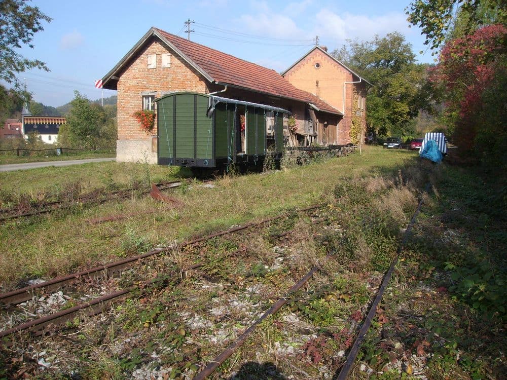 Die Jagsttalbahn verläuft hier direkt neben dem Kalksteinbruch. Von hier wurde der für den Bahnbau benötigte Gleisschotter bezogen und für ein paar Jahre gehörte der Steinbruch sogar zur Bahngesellschaft (DEBG).Einst war hier ein beidseitig angeschlossenes Ladegleis und eine Wasserstation mit kleinem Wasserhaus vorhanden.