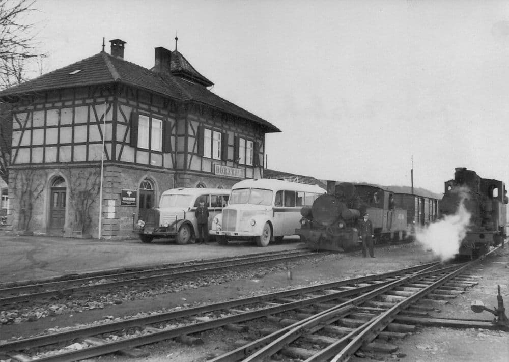 Lok 152 und 24² stehen vermutlich irgendwann in den 50er Jahren vor dem Bahnhofsgebäude in Dörzbach.