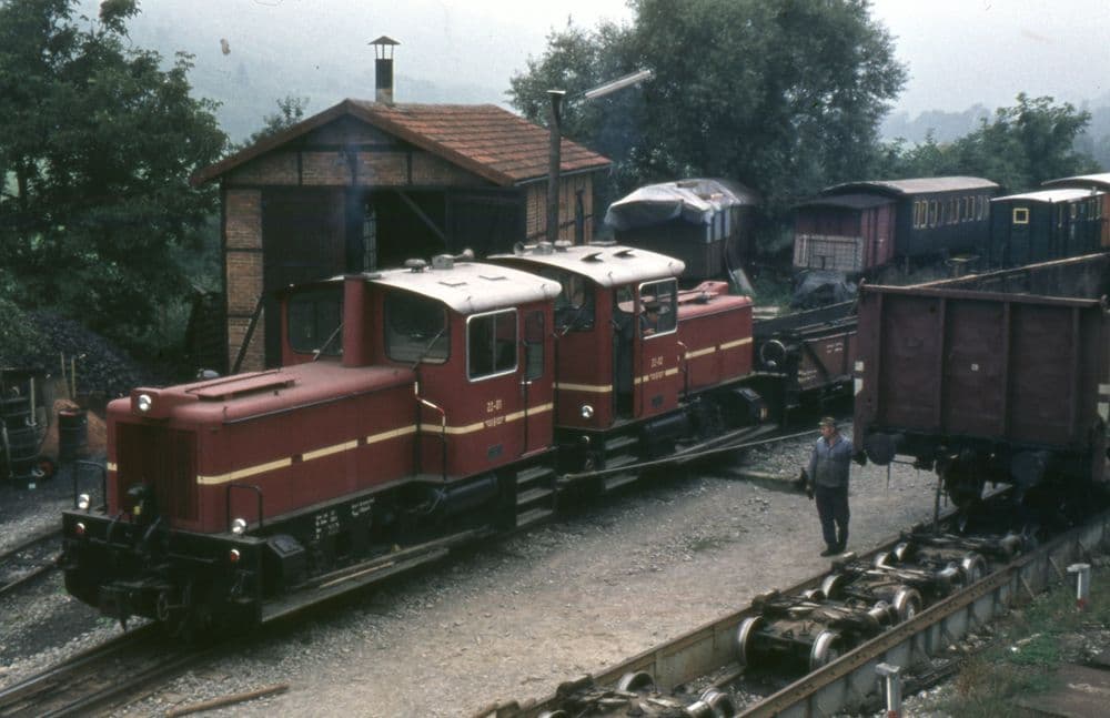 Das Jagsttal-Krokodil (22-01 und 22-02) rangiert am 20.09.1975 in Möckmühl.