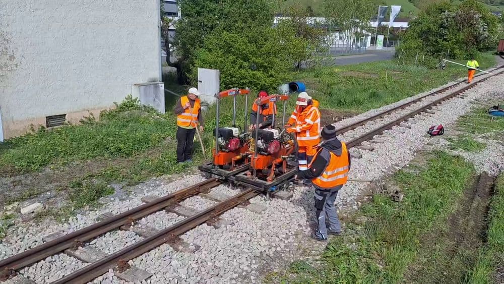 Mit Schwellenbohrmaschine (rechts) und Gleisschrauber (links) werden die Schienen auf den Schwellen befestigt.